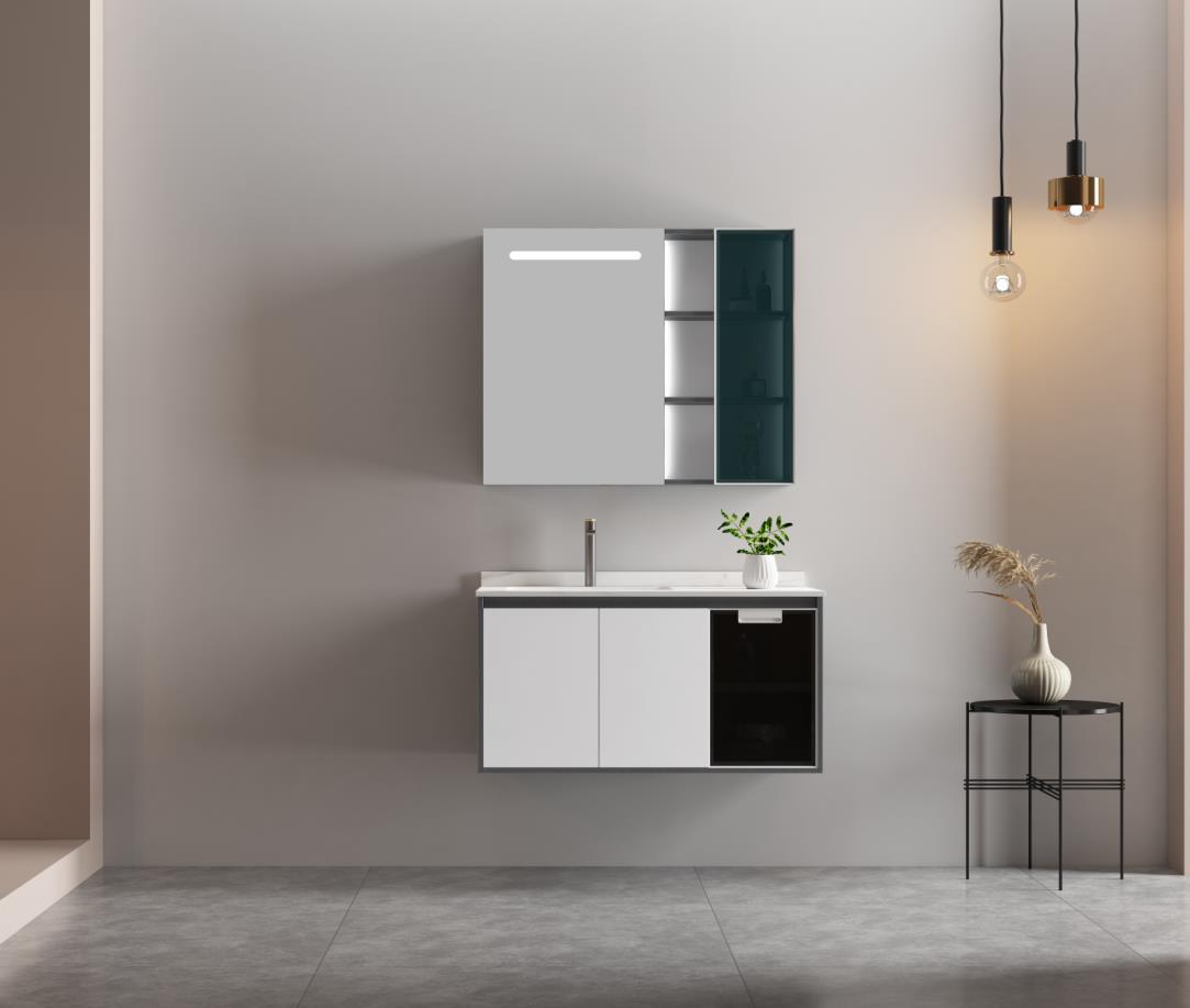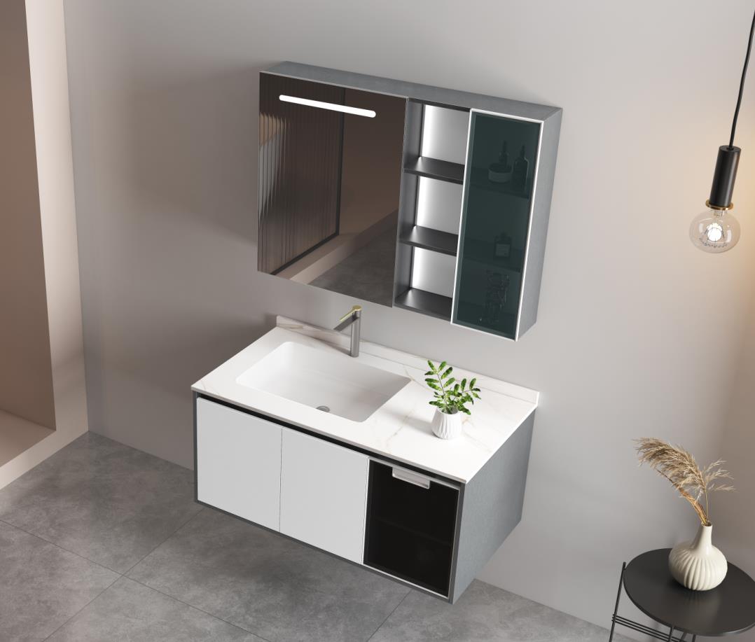 HOAA烤漆浴室柜,型号8114,材质实木、岩板、陶瓷、玻璃,主柜为烤漆门板,设计是左侧对开门储物,非抽屉,右侧黑色面板,抽屉模式,主柜台面颜色哥伦比亚白,材质岩板,工艺采用无缝对接瓷盆,美观大方,清理卫生无死角,镜柜采用左侧镜子,带灯,右侧为版开放储物格,共3层,余工大家居为该浴室柜设计了3种规格,具体参数与价格如下:
