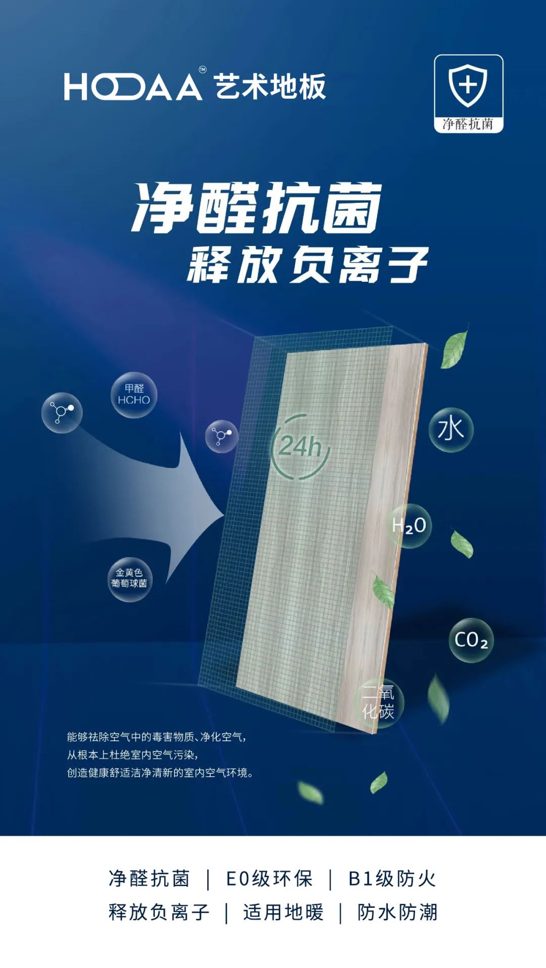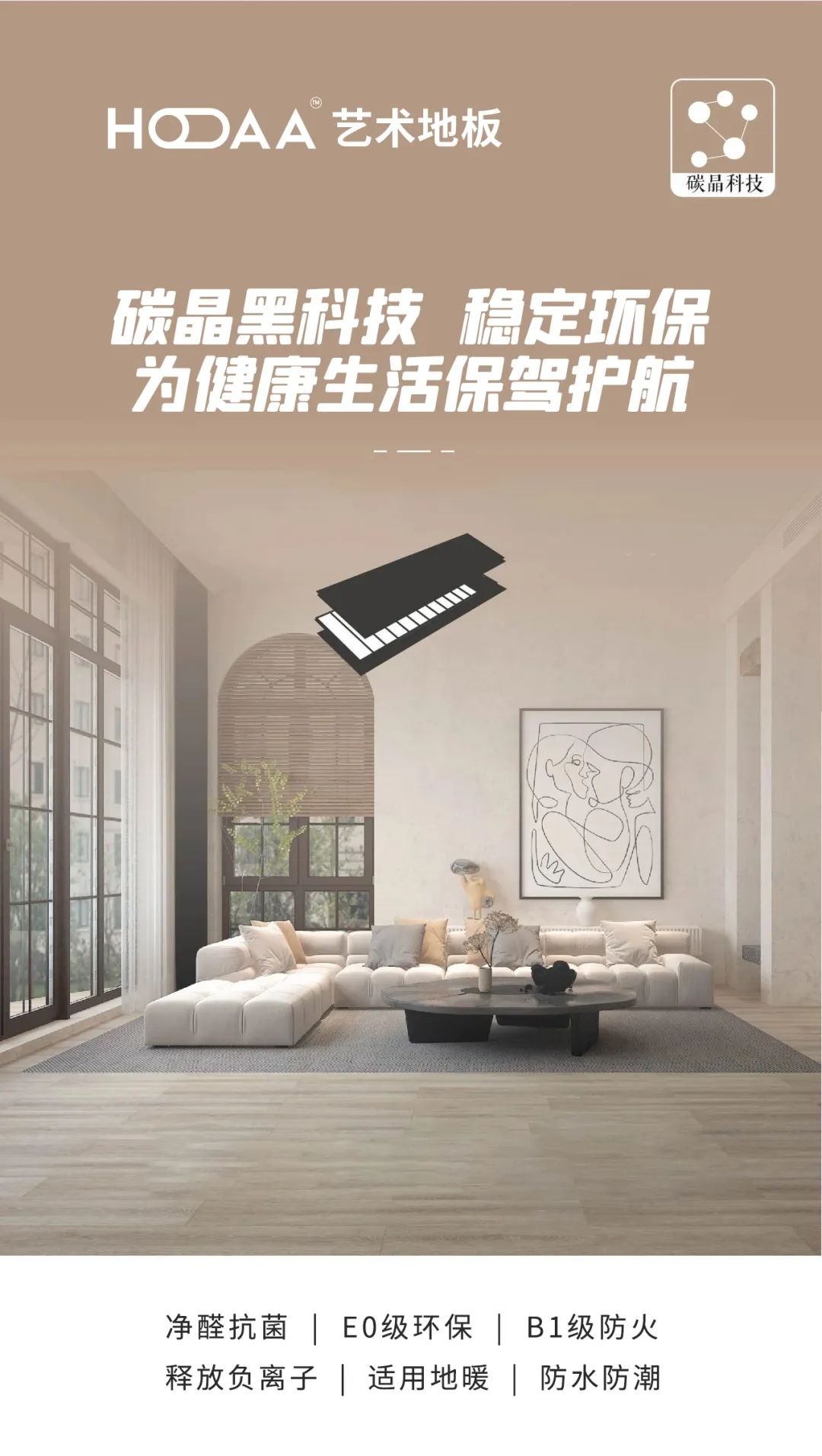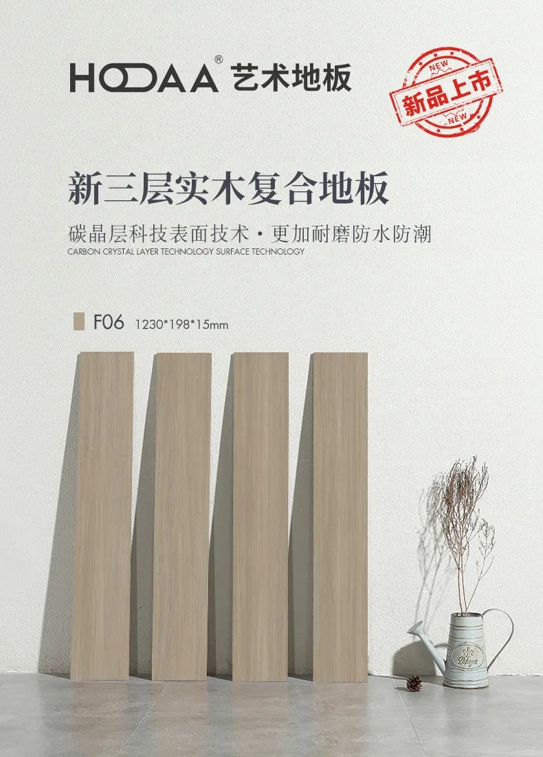 稳定耐用 HOAA碳晶净醛新三层实木复合地板质量稳定,不容易损坏。由于地板的基材采用了多层单板复合而成,木材纤维纵横交错成组合,使木材的各种内应力在层板之间相互适应,确保了木地板的平整性和稳定性。 此外,既能享受到大自然的温馨,又解决了实木地板难保养的问题。在遇热、遇潮的情况下,增强了木地板的稳定性,不容易出现干裂和变形的现象。 无醛添加 装好即住 HOAA新三层实木复合地板采用碳晶科技表面技术,选用EO级环保基材,碳晶表面科技,含黑色活性炭,能有效吸收甲醛,空间净化,E0级环保,让整个空间清新自然,安心健康,即装即住,大大节约时间。